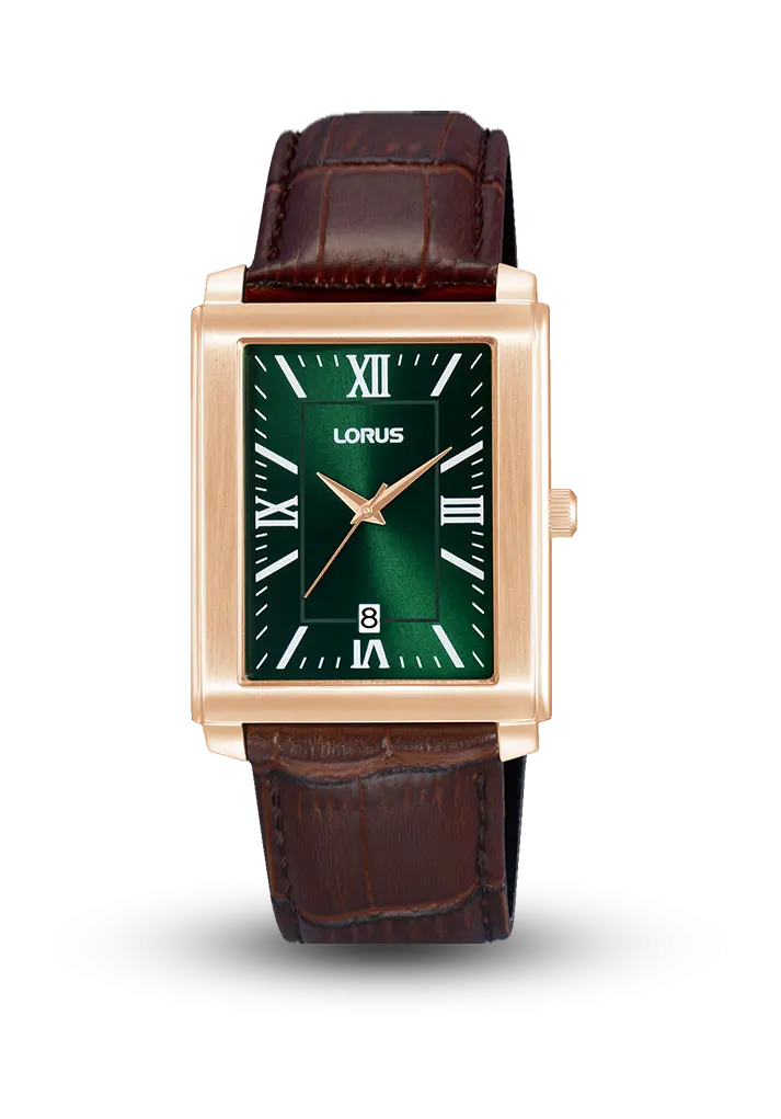 Klassik düzbucaqlı korpusu və tünd yaşıl siferblatı ilə fərqli və zövqlü görünüş təqdim edir. Qızılı tonlu korpus və qəhvəyi dəri kəmər birlikdə isti və premium estetika yaradır. 34 mm incə korpus biləkdə zərif görünür və rəsmi üslub üçün ideal seçimdir. 5 BAR suya davamlılıq və tarix funksiyası gündəlik istifadə üçün praktik üstünlük təmin edir. Zövqünü detallarla göstərmək istəyənlər üçün seçilən klassik modeldir.