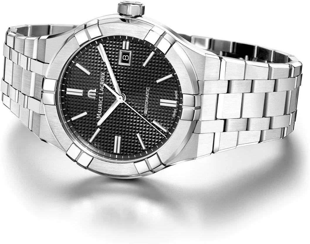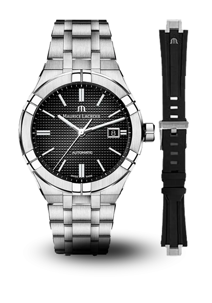 Maurice Lacroix Aikon Automatic Date 42MM müasir dizayn və İsveçrə saatçılıq ənənəsinin birləşməsini təqdim edir. Qara "Clous de Paris" naxışlı siferblat, paslanmayan polad korpus və avtomatik mexanizm saatı həm gündəlik, həm də klassik istifadə üçün ideal edir. Açıq arxa qapaq mexanizmin işləməsini izləməyə imkan verir.