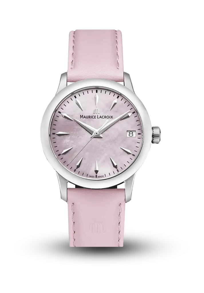 Maurice Lacroix 1975 Quartz 33 mm modeli klassik dizayn və zərif qadın üslubunu birləşdirən incə saatdır. Çəhrayı sədəf mother-of-pearl) siferblat işıq altında fərqli tonlarda parlayaraq saatın premium xarakterini vurğulayır. Minimalist paslanmayan polad korpus və çəhrayı dəri kəmər modeli zərif və eleqant görünüşlə tamamlayır. İsveçrə istehsalı quartz mexanizm gündəlik istifadə üçün yüksək dəqiqlik və etibarlılıq təqdim edir.
