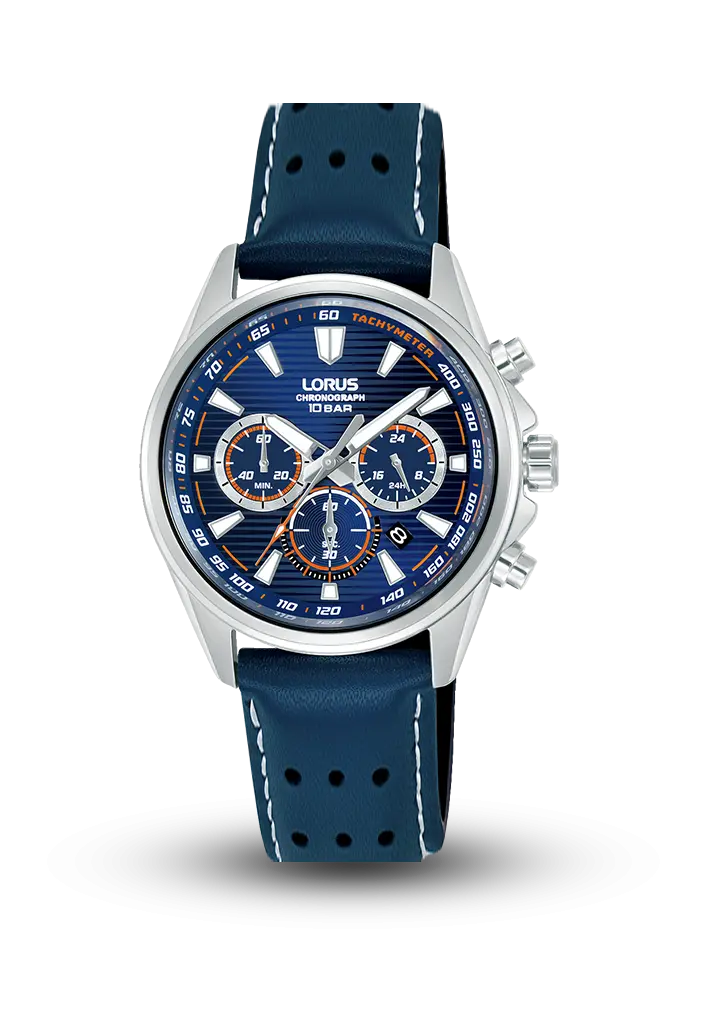 Dinamik idman üslubunu canlı rəng detalları ilə birləşdirən müasir kişi saatıdır. Göy siferblat üzərində narıncı aksentlər və xronoqraf alt-göstəriciləri modelə enerjili və fərqli görünüş verir. 43 mm ölçülü polad korpus və 100 metr suya davamlılıq aktiv həyat tərzi üçün ideal seçimdir. Göy dəri kəmər və ağ tikiş detalları isə saatın sportiv xarakterini tamamlayır.