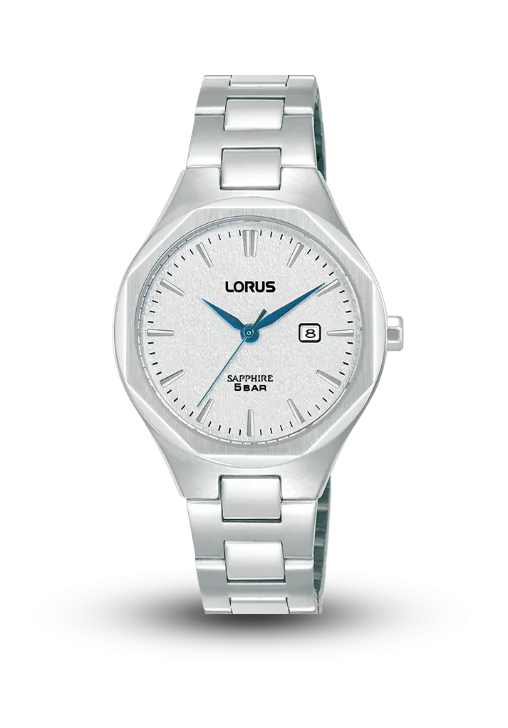 Minimal və zərif dizaynı ilə gündəlik istifadə üçün ideal qadın saatıdır. Gümüşü-ağ teksturalı siferblat və mavi tonlu əqrəblər modelə incə kontrast verir. 32 mm ölçülü incə korpus, cızılmaya davamlı safir şüşə və 5 BAR suya davamlılıq funksiyası saatı həm estetik, həm də praktik seçim edir. Gümüşü polad qolbaq klassik üslubu tamamlayır.