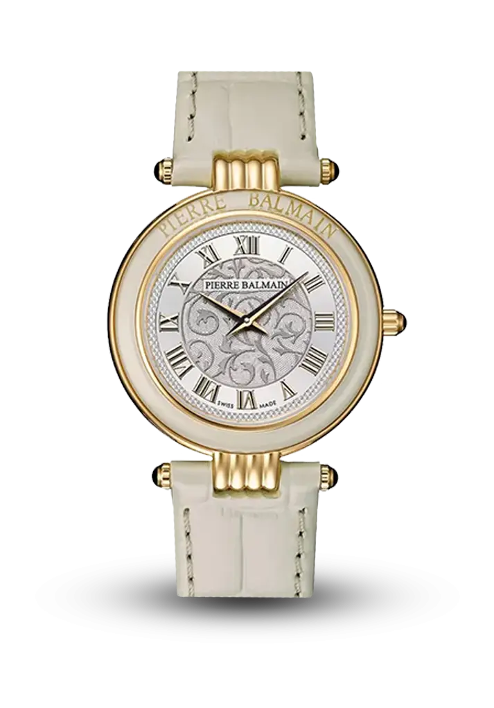 Balmain Haute Elegance - klassik Paris dəbinin ruhunu daşıyan, zəriflik və incəliyin təcəssümü olan bir modeldir. Qızılı PVD korpus, roma rəqəmləri ilə bəzədilmiş siferblat və incə giloş naxış saata lüks və qadınsı bir xarakter bəxş edir. Krem rəngli dəri kəmər onun klassik üslubunu tamamlayır, Swiss Made kvars mexanizmi isə dəqiqlik və etibarlılıq təmin edir.