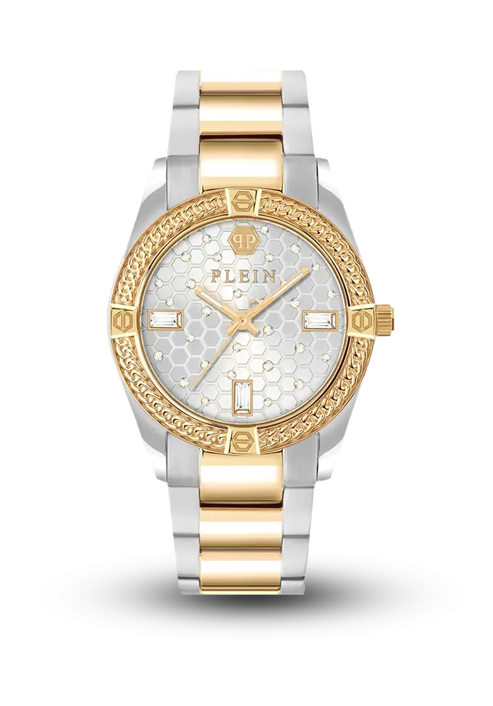 İki tonlu (gümüş–qızılı) korpus və bilək qayışı ilə diqqət çəkən dəbdəbəli model. Zəncir detalı ilə vurğulanan bezel, gümüş naxışlı siferblat və kristal indekslər saatı həm parlaq, həm də iddialı edir. 36 mm korpus ölçüsü, 5 ATM sukeçirməzlik və quartz mexanizm gündəlik istifadə üçün rahatlıq və dəqiqlik təmin edir.