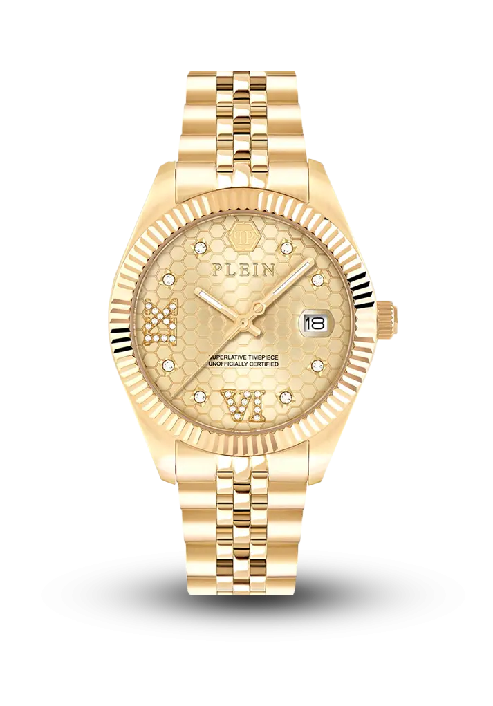 Philipp Plein brendinin Date Superlative kolleksiyasına aid bu model zəriflik və lüksü bir araya gətirir. Tamamilə qızılı rəngdə dizayn edilmiş saat, həm gündəlik, həm də ziyafət geyimləri üçün ideal aksesuardır. Siferblatı və çərçivəsi (bezel) parıldayan kristallarla bəzədilərək brendin ikonik və cəsarətli üslubunu əks etdirir.