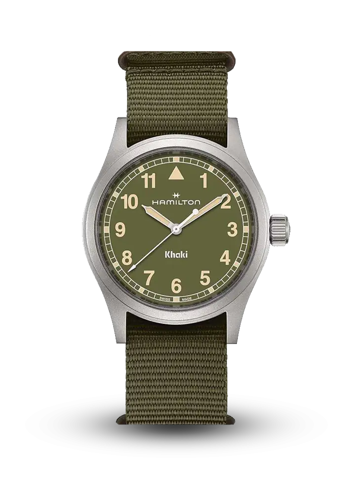 Khaki Field Quartz - Hamiltonun hərbi irsə dizayndakı sadəlik və funksionallıq vasitəsilə qayıdışın ifadəsidir. Macəra ruhu üçün yaradılmış bu model, etibarlı və dözümlü yoldaş kimi kəşf üçün hər an hazırdır.