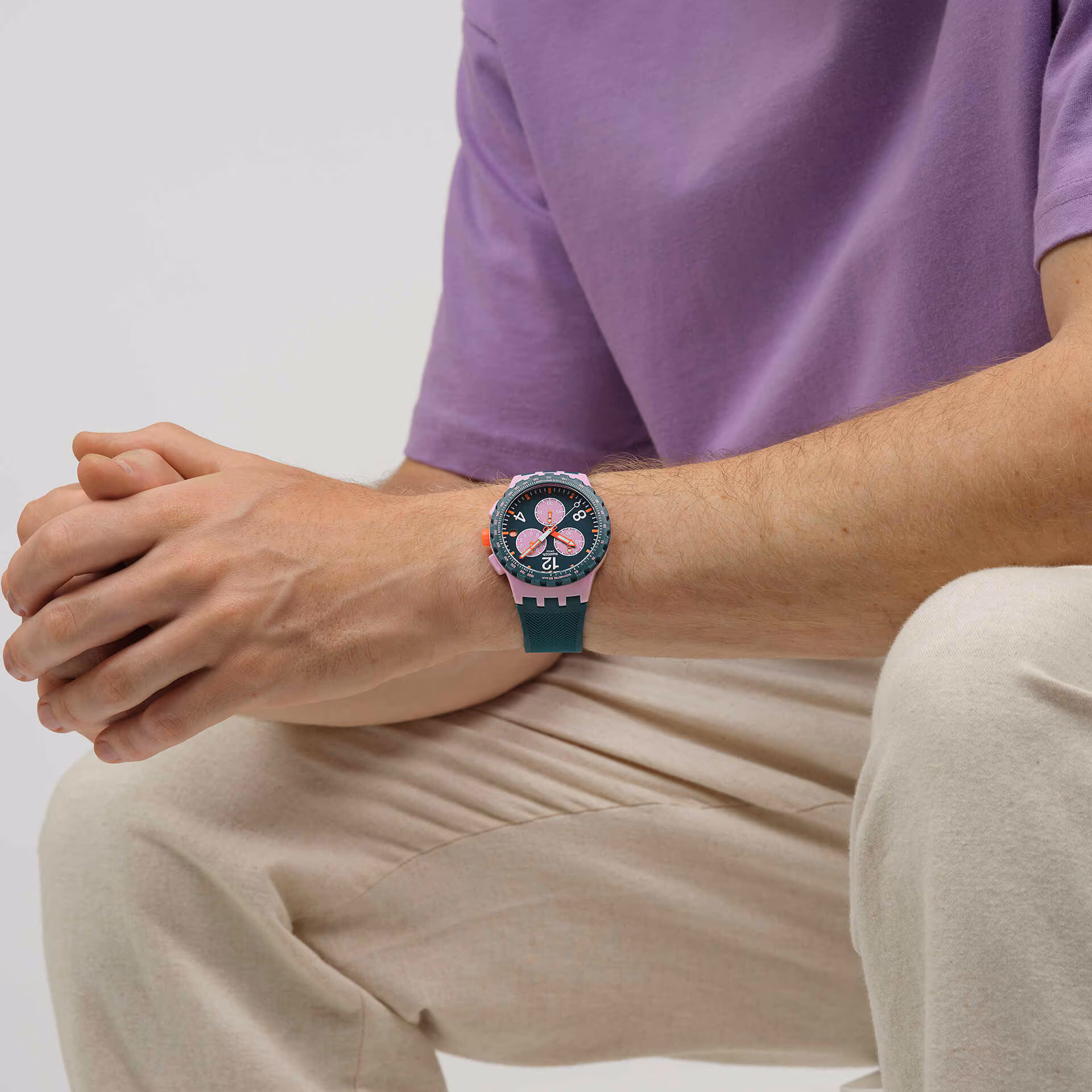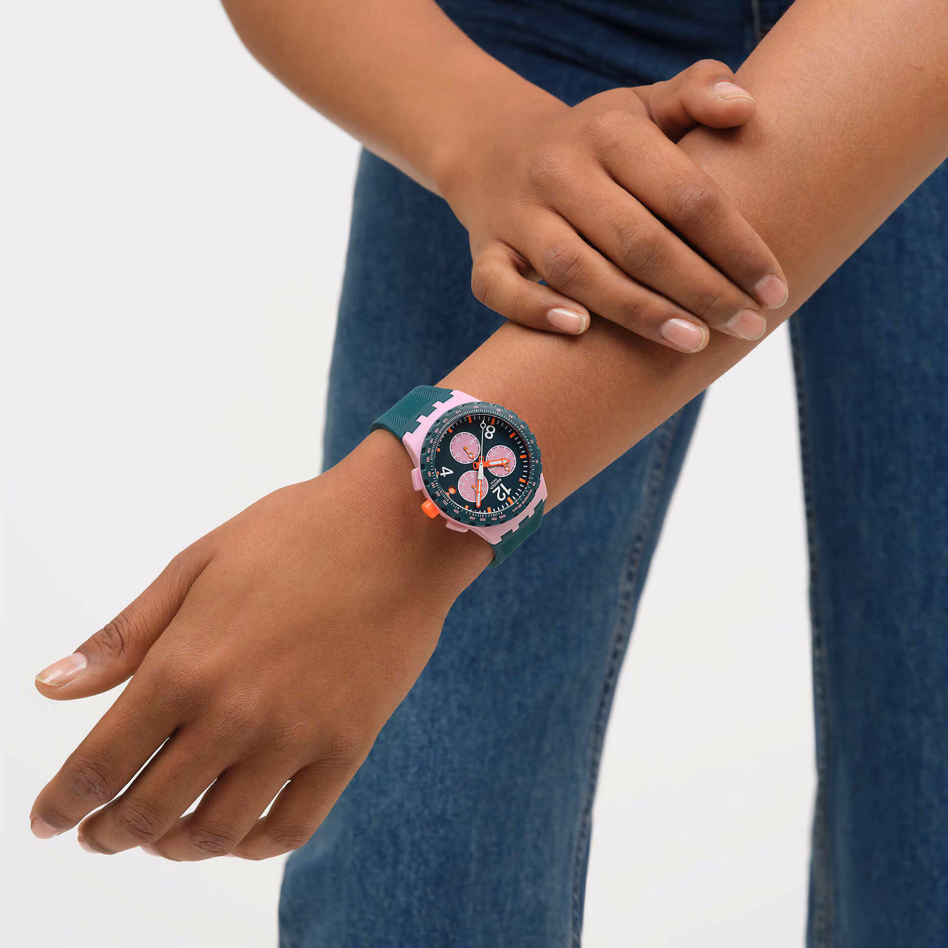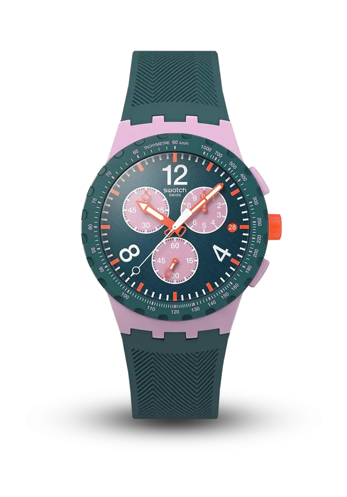 Bu saatın teksturalı tünd yaşıl kadranı ağ rəngdə rəqəmlər və narıncı-ağ dəqiqə göstəriciləri ilə bəzədilib. Çəhrayı kiçik kadranlarda narıncı göstəricilər qaranlıqda parlayır, 3-cü saatda isə tarix pəncərəsi yerləşir. Narıncı saat və dəqiqə göstəriciləri qaranlıqda parlayan effekti daşıyır, ağ saniyə göstəricisi isə vaxtı göstərir. Mat çəhrayı korpus mat tünd yaşıl bezel və çəhrayı-ağ çaplı taksiometr miqyası ilə tamamlanır. Teksturalı tünd yaşıl kəmər, mat çəhrayı hissə və qapaq saata tam görünüş verir.