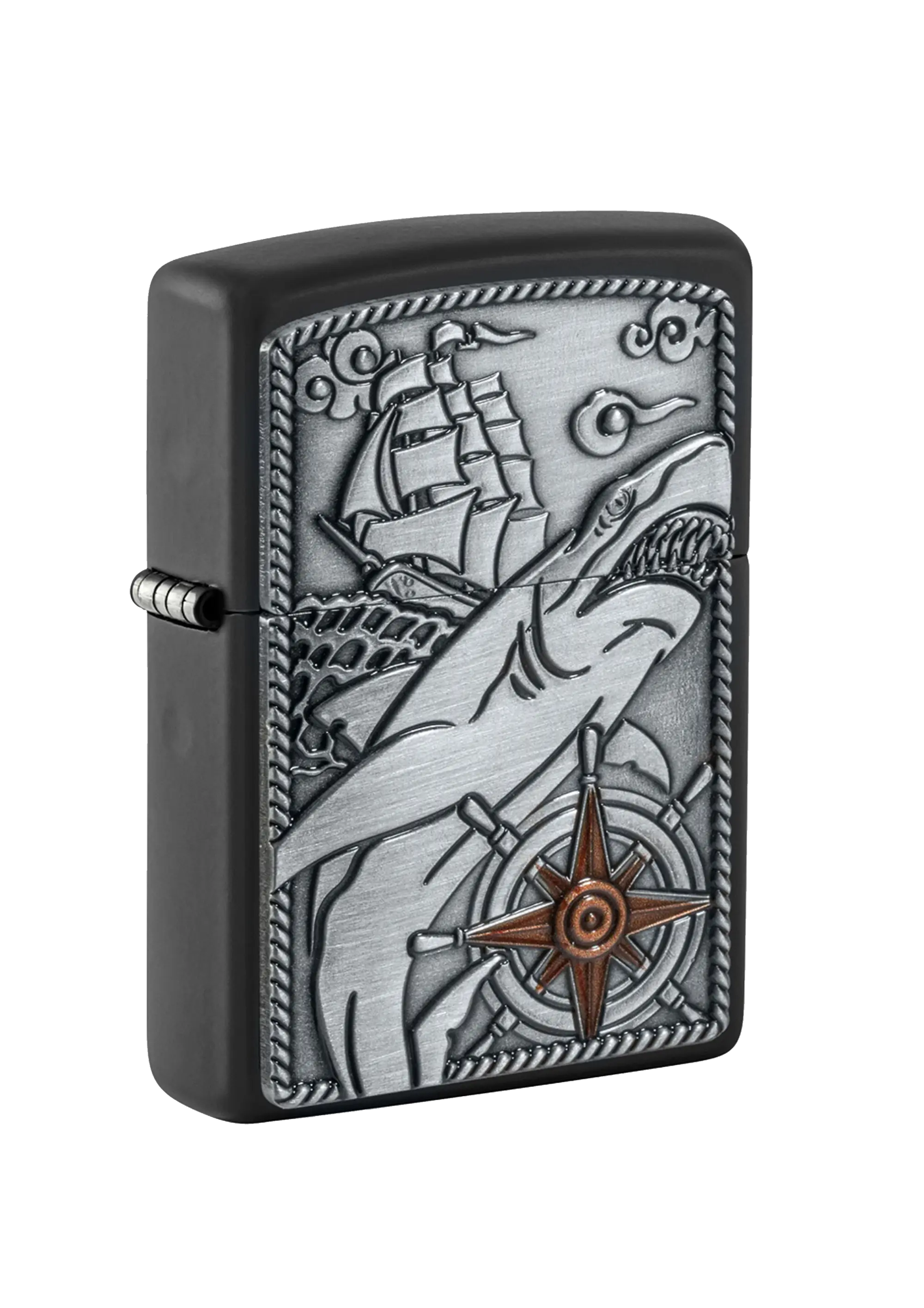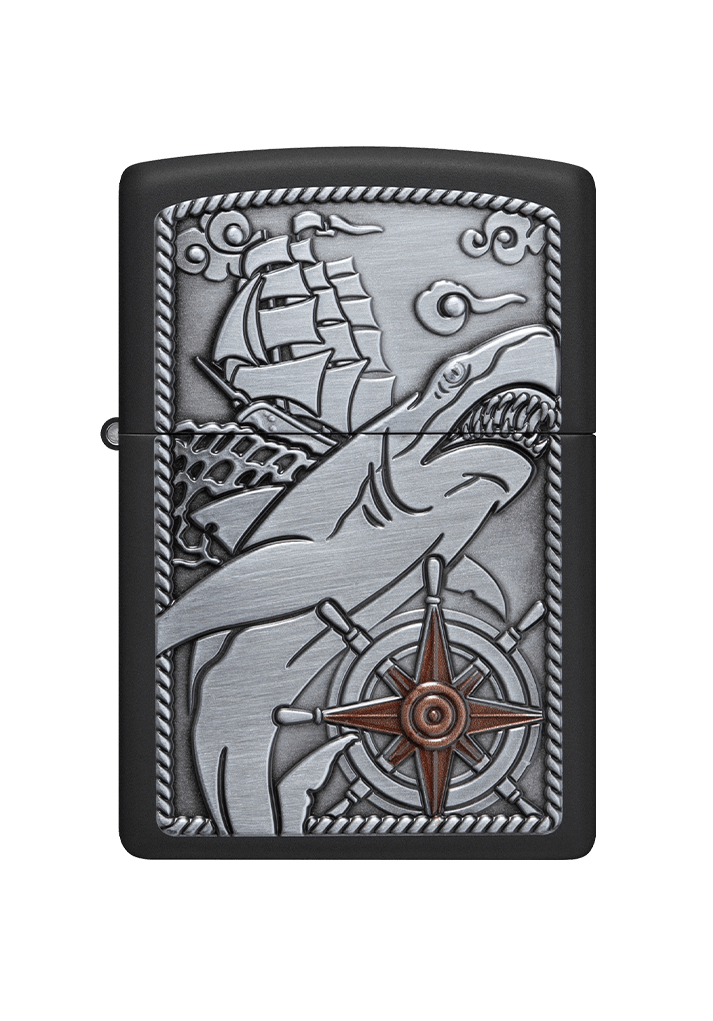 dəniz mövzusunda hazırlanmış fərqli və diqqətçəkən dizayna malik modeldir. Korpus üzərində yerləşdirilmiş relyefli emblem kompozisiyasında köpəkbalığı, yelkənli gəmi və kompas təsviri macəra, güc və istiqamət simvolu kimi təqdim olunur. Metal səth üzərindəki detallı işləmə alışqana kolleksiya dəyəri qazandırır. Möhkəm metal konstruksiya və küləyə davamlı Zippo mexanizmi açıq havada belə etibarlı alış təmin edir. Dəfələrlə doldurula bilən quruluş uzunmüddətli istifadə üçün nəzərdə tutulmuşdur. Model orijinal Zippo hədiyyə qutusunda təqdim olunur və həm istifadə, həm də hədiyyə üçün ideal seçimdir.