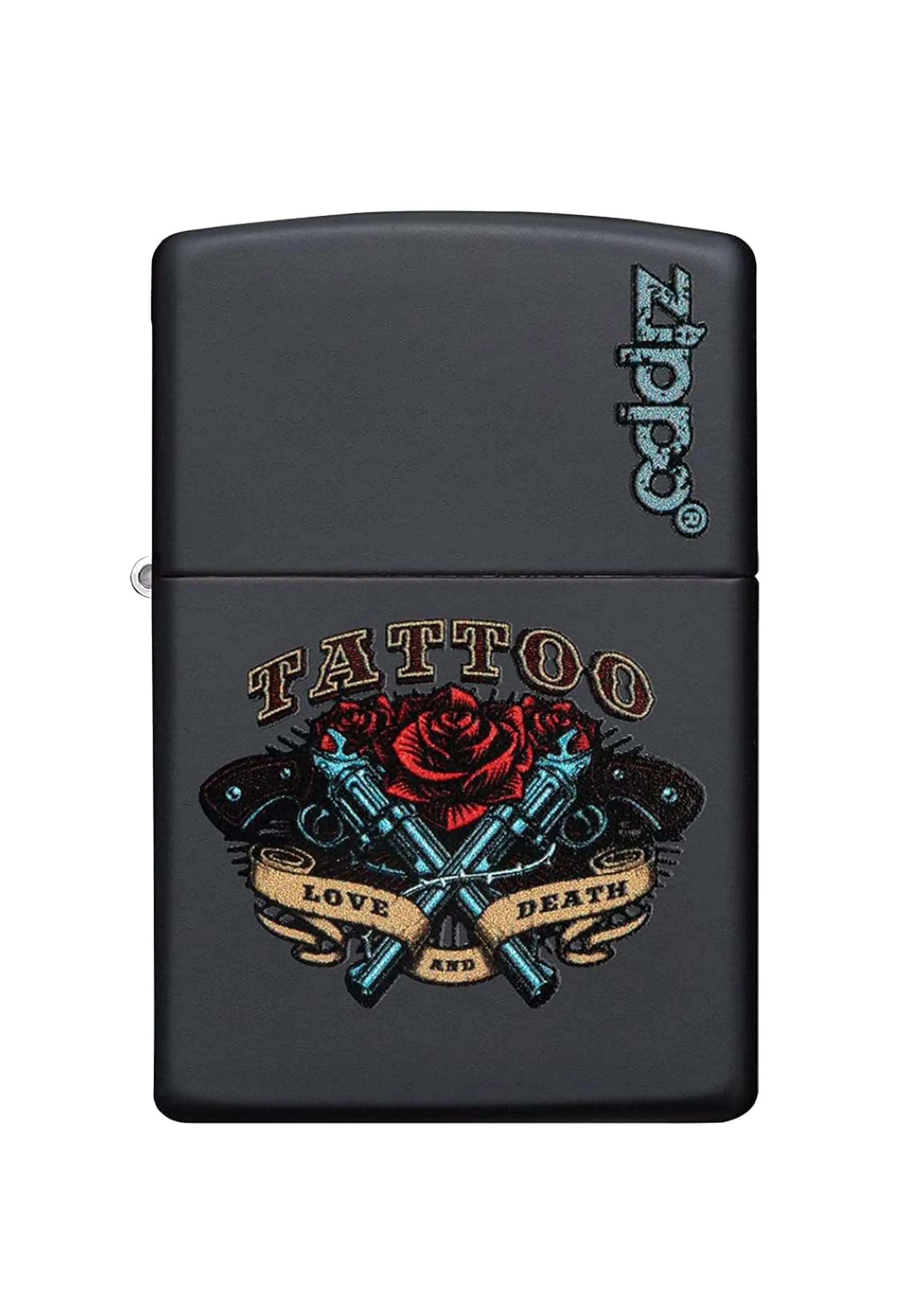 Klassik tərzi və simvolik dizaynı sevənlər üçün ideal seçim olan bu Zippo modeli, qara mat korpus üzərində yüksək keyfiyyətli rəngli çap texnologiyası ilə işlənmişdir. Tatirovka üslublu dizayn-çarpaz xəncərlər, qırmızı qızılgül və bəzəkli lent təsviri ilə alışqana xüsusi bir cəlbedicilik qatır. Zippo-nun patentləşdirilmiş küləyə davamlı texnologiyası sayəsində istənilən hava şəraitində rahat istifadə edilə bilir.