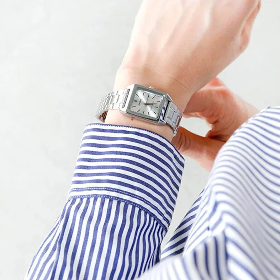 Model zərif və minimalist bir estetikaya malikdir. Kvadrat korpusu incə xətlərlə işlənmiş, gümüş rəngli metal zənciri isə klassik bir görünüş yaradır. Saat taxdığınızda sanki zaman sakitcə sizinlə birlikdə axır.