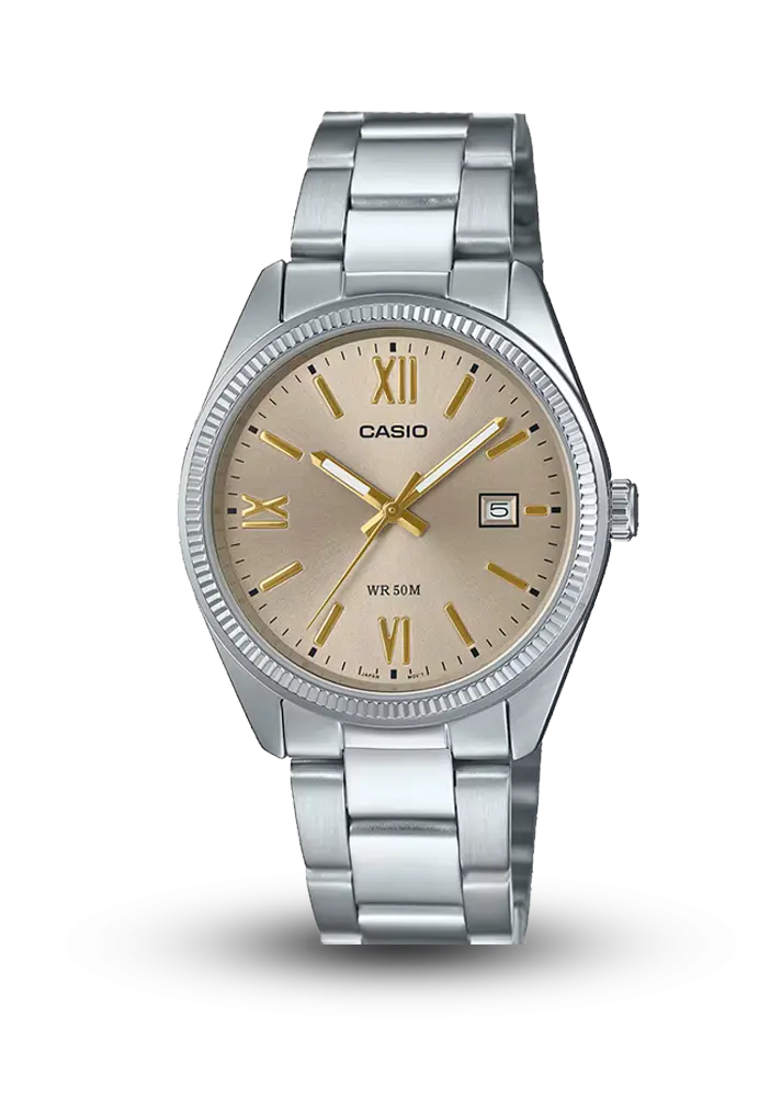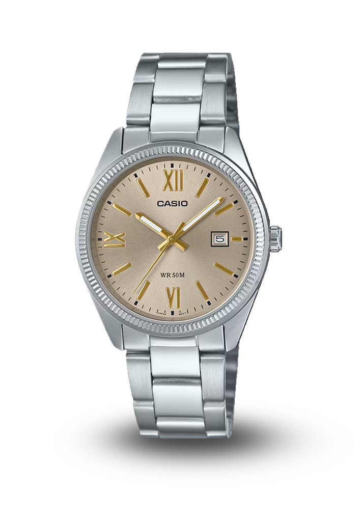 Bu saat, sanki gün batımının yumşaq bej‑qızılı işığını biləyində saxlayan incə bir xatirədir. Metal zənciri soyuq, parlaq bir lövhə kimi parıldayır, dial isə günəşin yumşaq şüalarının rəqs etdiyi səssiz bir səhnəni xatırladır. Tarix pəncərəsi isə zamanın ritmini yumşaq bir nəsihət kimi göz önündə saxlayır.
