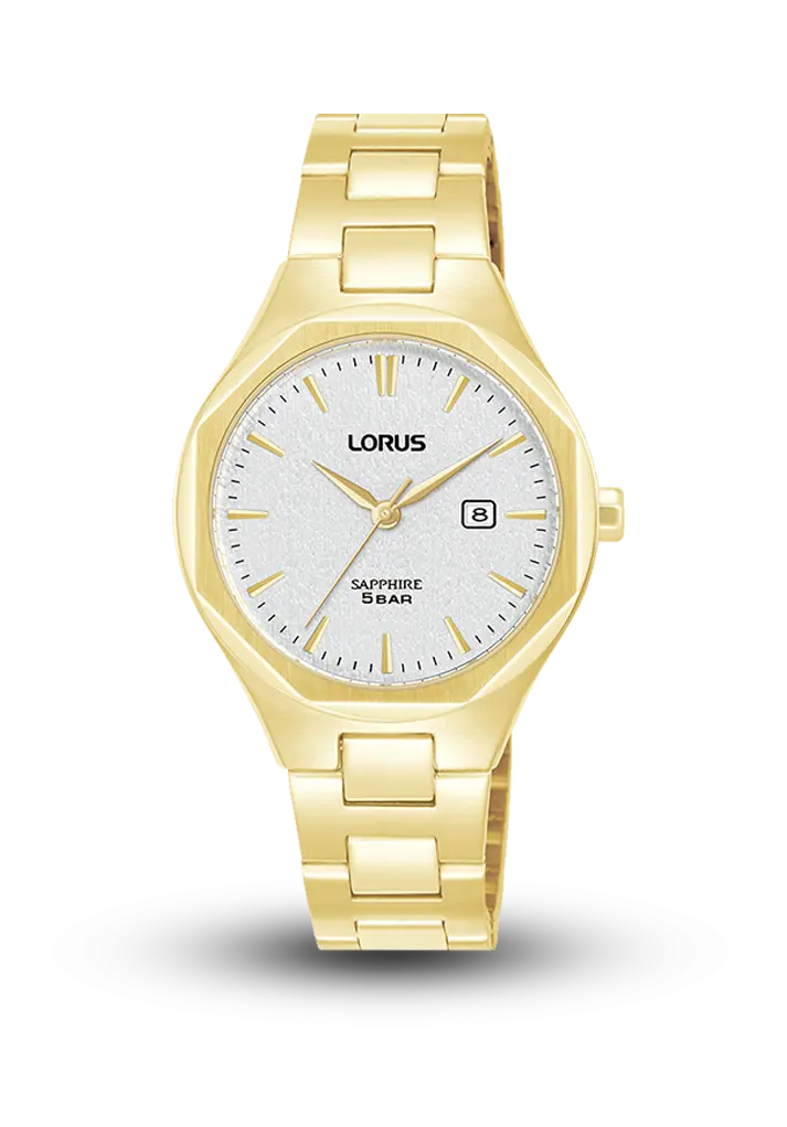 Tam qızılı dizaynı ilə zərif və diqqətçəkən qadın saatıdır. Gümüşü-ağ teksturalı siferblat və qızılı indekslər klassik eleqantlıq yaradır. 32 mm ölçülü incə korpus, cızılmaya davamlı safir şüşə və 5 BAR suya davamlılıq funksiyası modeli həm gündəlik, həm də xüsusi günlər üçün uyğun edir. Qızılı polad qolbaq isə saatın premium görünüşünü tamamlayır.
