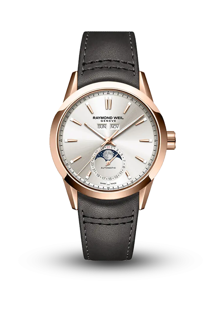 Raymond Weil özünün ilk Complete Calendar (tam təqvim) funksiyalı Freelancer modelini təqdim edir. Bu model tarix, gün, ay və ay fazası göstəriciləri ilə təchiz olunub və yenidən dizayn edilmiş 40 mm korpusa malikdir. Dune (isti bej) siferblat, çəhrayı qızıl tonlu indekslər və işıqla oynayan tekstura ilə eleqant görünüş yaradır. Ay fazası göstəricisi real NASA görüntüsündən ilhamlanaraq hazırlanıb. Çəhrayı qızıl PVD örtüklü paslanmayan polad korpus və tünd qəhvəyi dana dərisindən kəmər klassik lüksü vurğulayır. Freelancer Complete Calendar - ənənəvi İsveçrə ustalığının və müasir zərifliyin ahəngini ifadə edən, azad ruhlu və incə zövqlü saatdır.