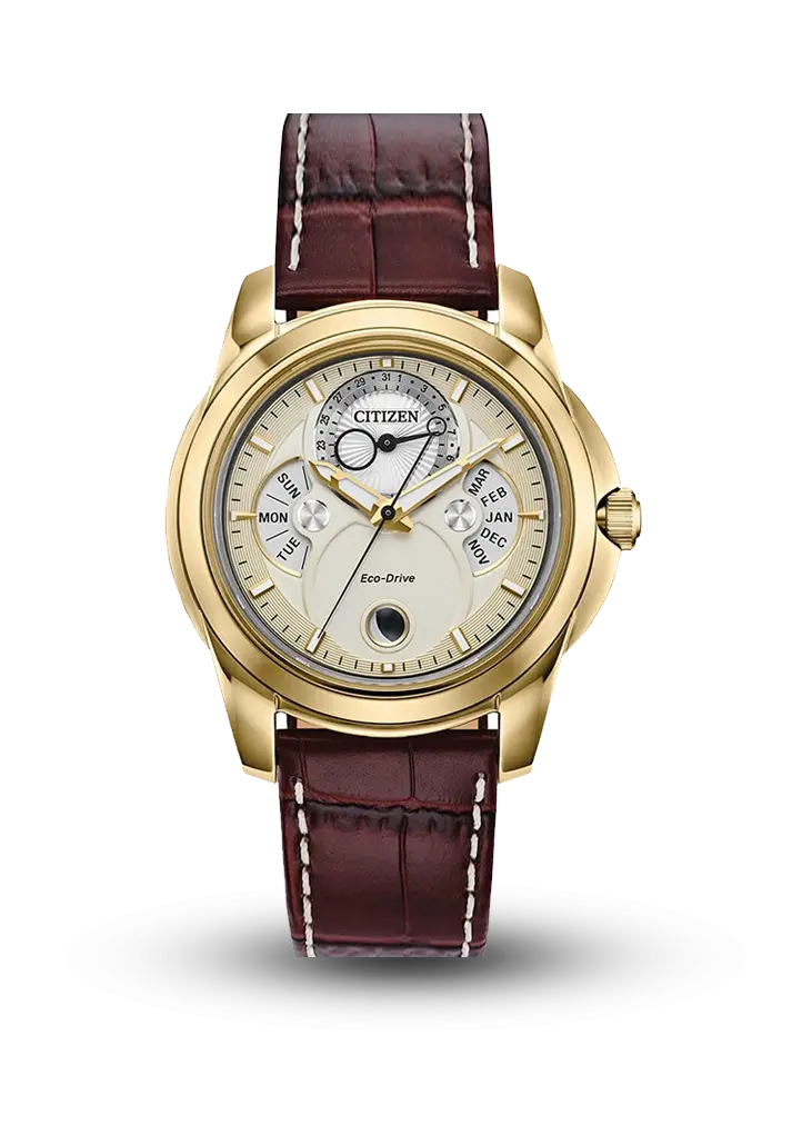 Klassik dizaynı müasir texnologiya ilə birləşdirən zərif modeldir. Qızılı rəngli korpus, krem tonlu siferblat və qəhvəyi dəri kəmər saata premium və eleqant görünüş verir. Model Eco-Drive texnologiyası ilə işləyir - işıq enerjisi ilə yüklənir və batareya dəyişiminə ehtiyac yoxdur. Çoxfunksiyalı siferblatda gün, tarix, ay və 24 saat göstəriciləri mövcuddur. Həm işgüzar üslub, həm də klassik geyim üçün ideal seçimdir.