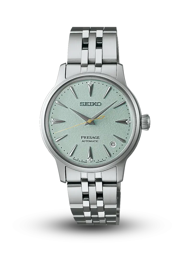 Seiko Presage Cocktail Time - incə dizayn və zərif detalların mükəmməl vəhdətidir. Pastel yaşıl, teksturalı siferblat almaz effektli indekslərlə tamamlanır və saata eleqant parıltı qatır. Avtomatik mexanizmə malik bu model gündəlik istifadə üçün rahat, xüsusi anlar üçün isə ideal seçimdir.