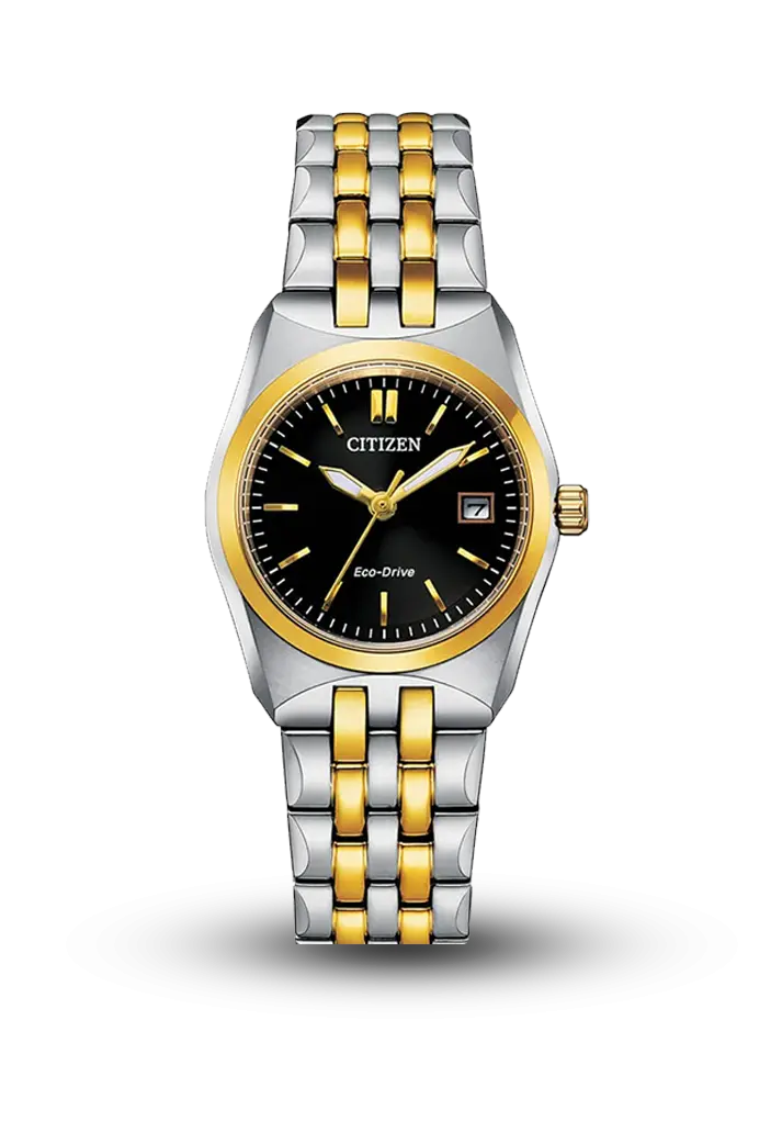 Klassik və eleqant dizayna malik qadın saatıdır. Qızılı-gümüşü rəngli paslanmayan polad korpus və qolbaq, qara siferblat üzərində zərif indekslərlə mükəmməl harmoniya yaradır. Eco-Drive texnologiyası sayəsində istənilən işıqla işləyir və batareyaya ehtiyac duymur. Tarix göstəricisi və suya davamlı quruluşu onu həm gündəlik, həm də klassik üslub üçün ideal edir.