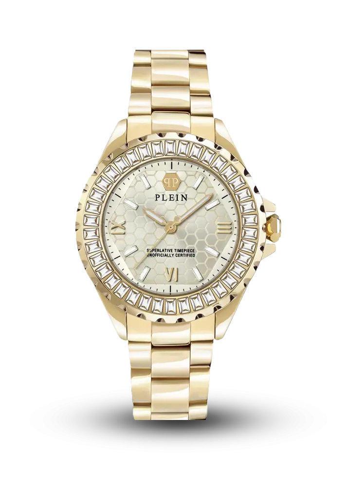 Heaven qadın saatı modern eleqantlıq və zərif dəbdəbəni bir araya gətirir. 38 mm ölçülü qızılı PVD örtüklü paslanmayan polad korpus baget formalı kristallarla bəzədilmiş bezel ilə diqqət çəkir. Altıbucaqlı naxışlı şampan rəngli siferblat və zərif indekslər saata eleqant görünüş verir. Kvars mexanizmi dəqiq vaxt göstərişi təmin edir. Qızılı polad qolbaq və düyməli qatlanan bağlama rahatlıq yaradır. 5 ATM suya davamlılıq gündəlik istifadə üçün uyğundur. Zərif və şıq üslubu sevən xanımlar üçün ideal aksesuardır.