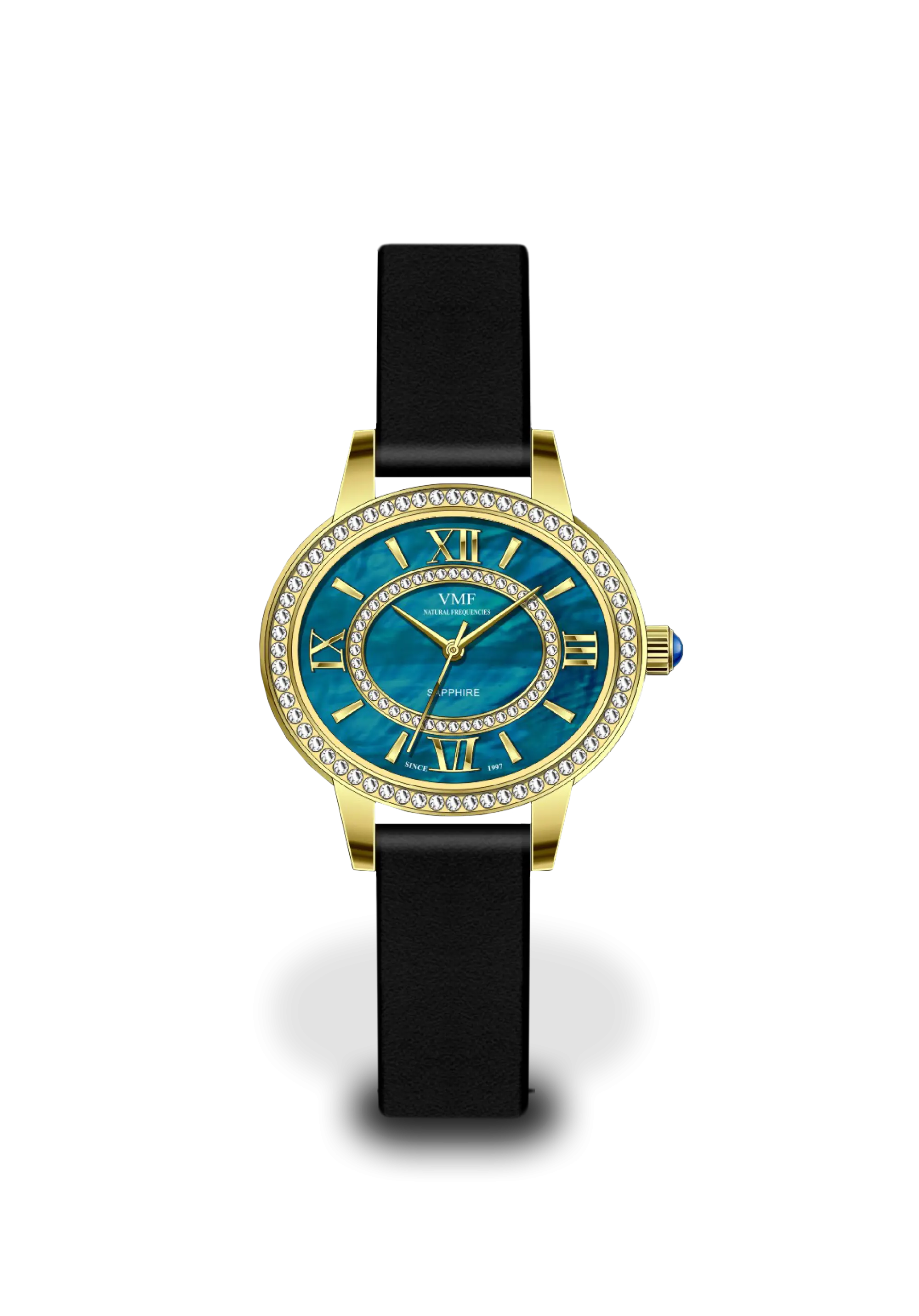 Firuzəyi sədəf siferblata malik bu model, diqqət çəkməyi sevən xanımlar üçün güclü bir üslub bəyanatıdır. Dərin və zəngin rəng tonu, bezel və siferblat boyunca yerləşdirilmiş 90 ədəd Çex daşının parıltısı ilə tamamlanaraq əsl zərgərlik dəyəri qazandırır.