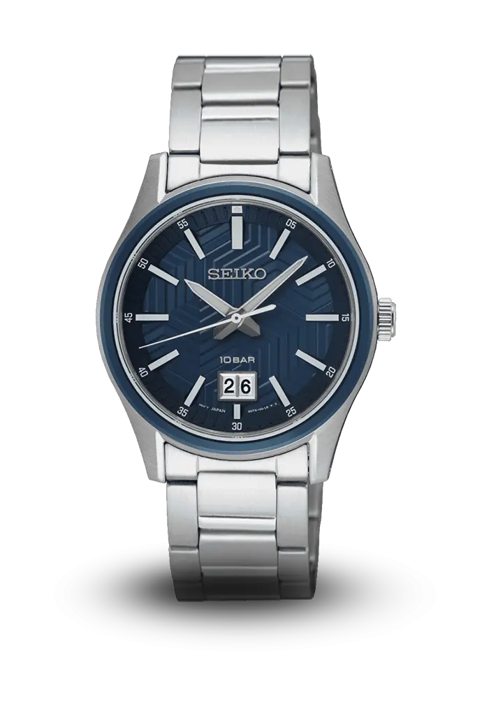 Seiko kişi saatı müasir və dinamik dizaynı ilə seçilir. Mavi teksturalı siferblat, paslanmayan polad korpus və qolbağ ilə tamamlanır. Tarix göstəricisi, 10 ATM suya davamlılıq və yüksək oxunaqlıq bu modeli gündəlik və aktiv həyat tərzi üçün ideal seçimə çevirir.