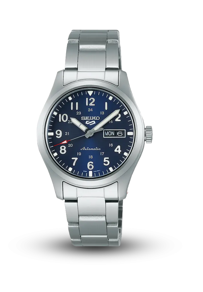 Seiko 5 Sports modeli klassik hərbi (Field) üslubunda hazırlanmış etibarlı avtomatik saatdır. Sadə və oxunaqlı göy siferblatı, böyük ərəb rəqəmləri və 24 saatlıq daxili göstərici halqası saatın funksional və praktik dizaynını tamamlayır. Bu model gündəlik istifadə, səyahət və aktiv həyat tərzi üçün ideal seçimdir.